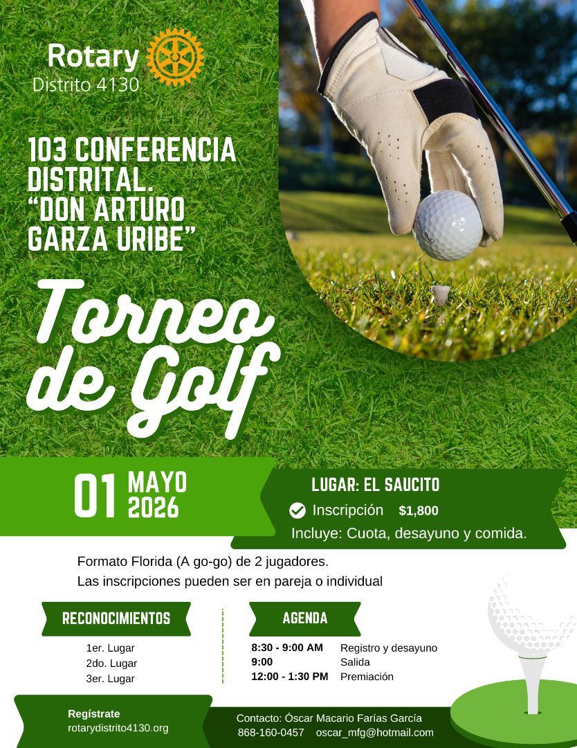 El Distrito 4130 de Rotary te invita cordialmente a participar en el Torneo de Golf organizado en el marco de la 103 Conferencia Distrital, un evento diseñado para convivir, fortalecer lazos de compañerismo y disfrutar de una jornada deportiva en un ambiente de amistad y servicio.